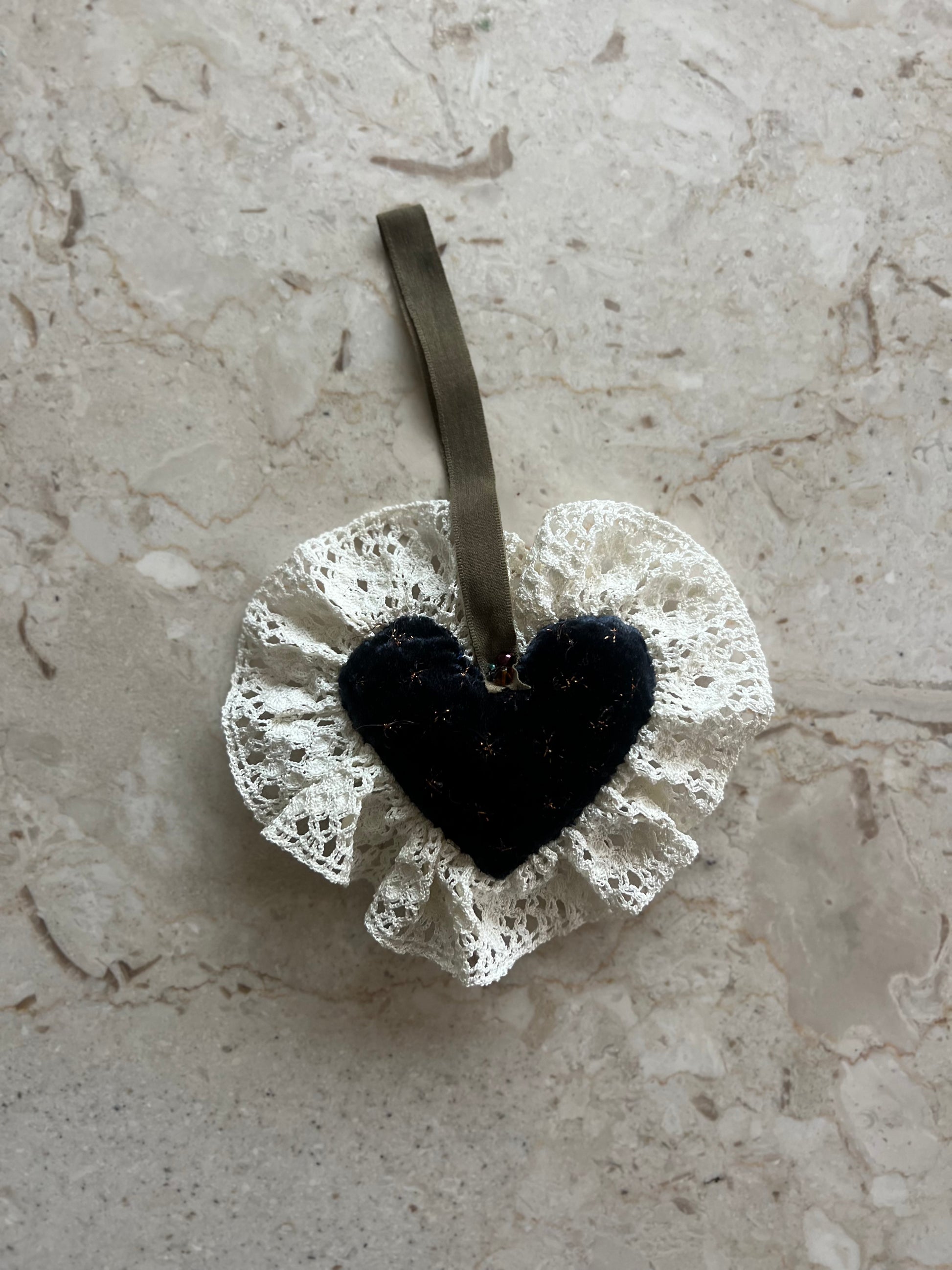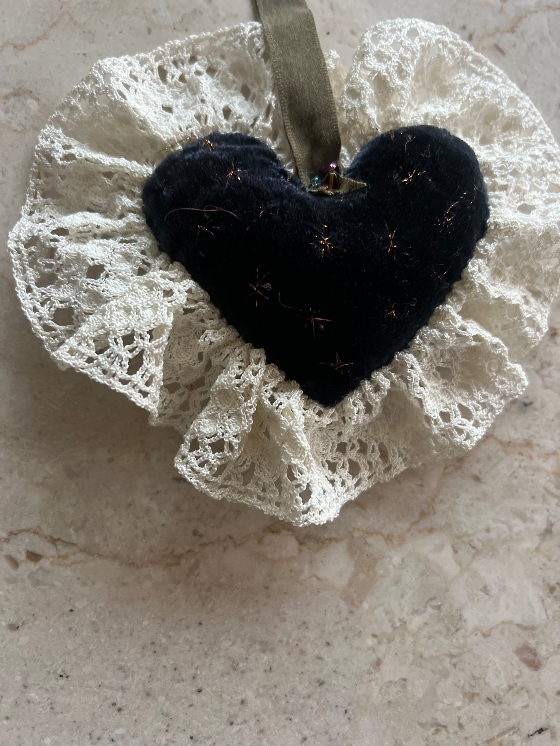 Mått: 15x17 cm cm totalt inklusive volang i spets. Inklusive hänget är dekratioen 22 cm hög.