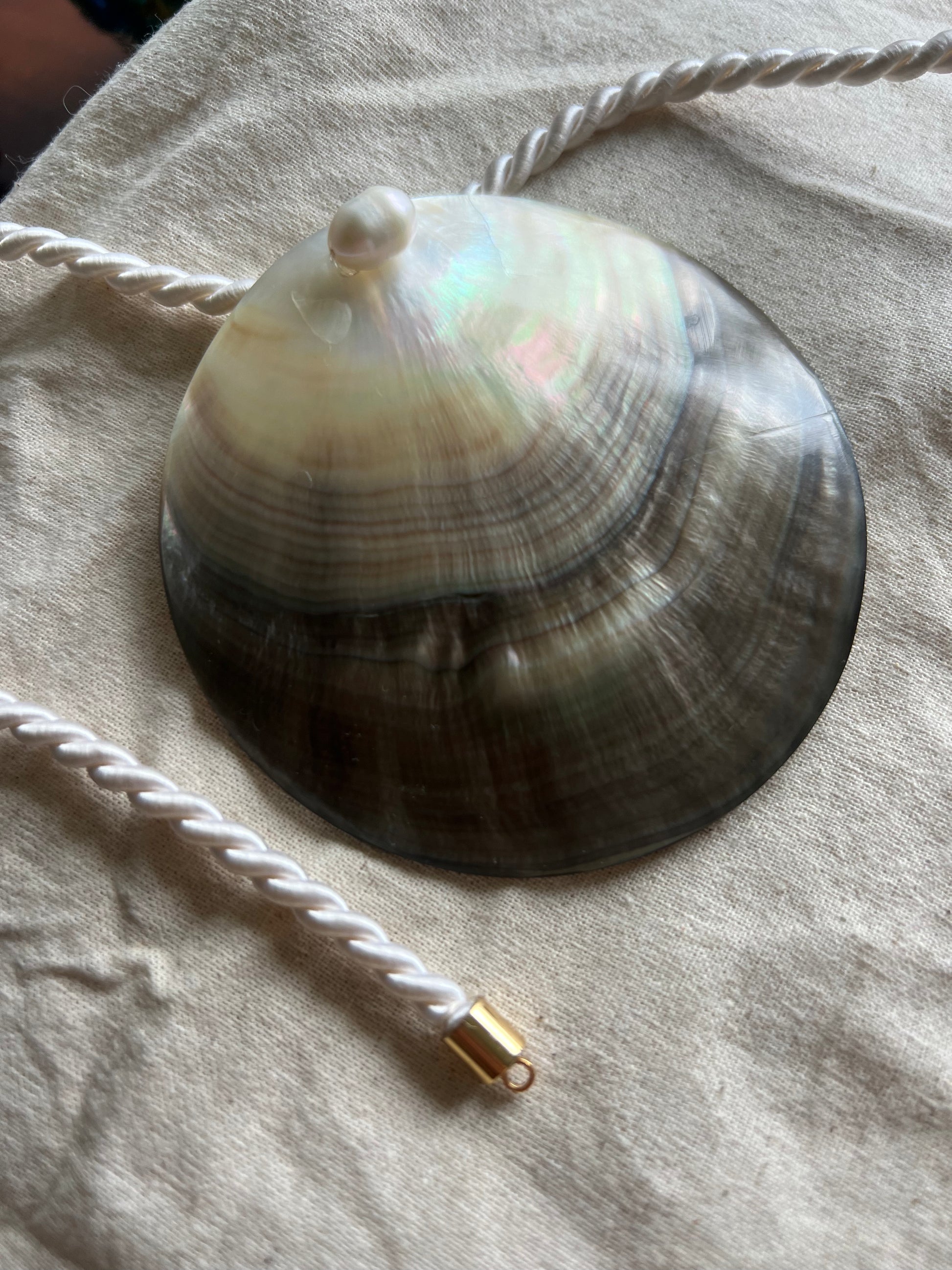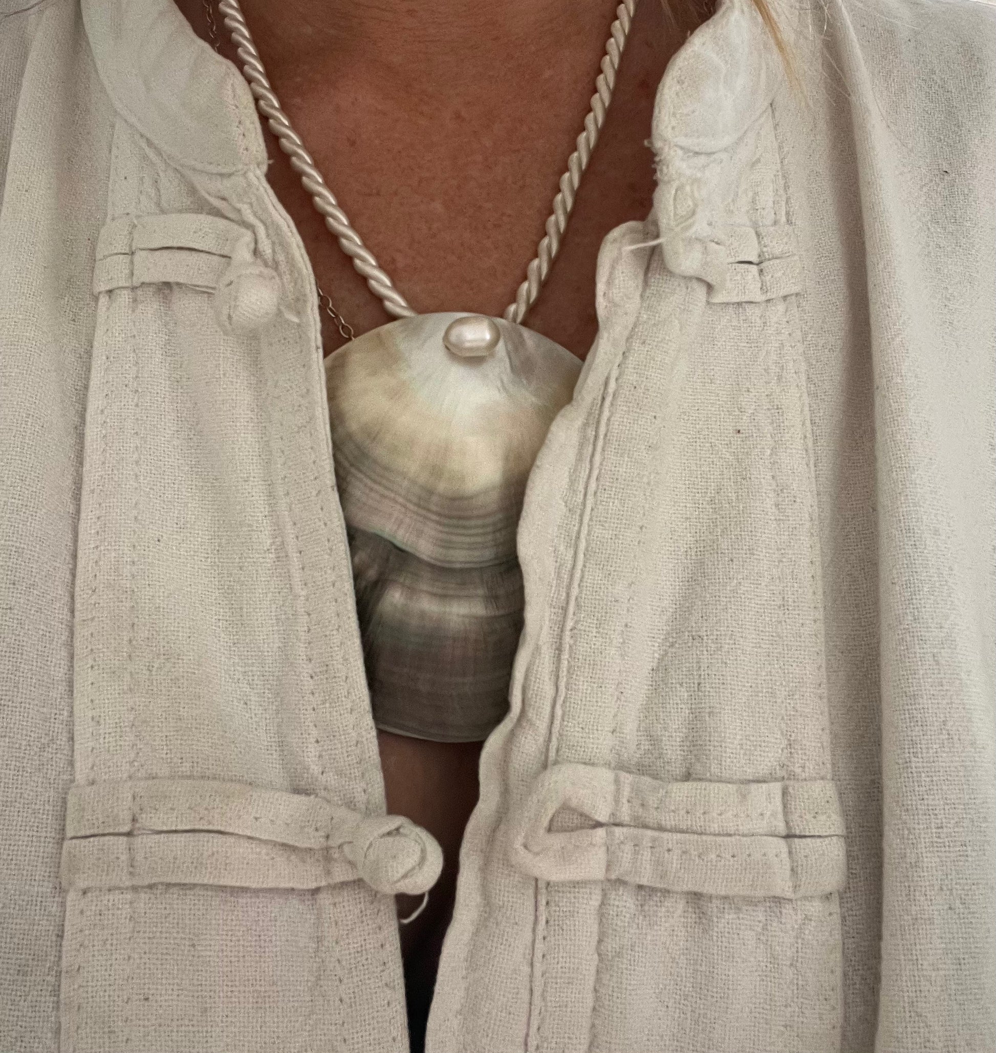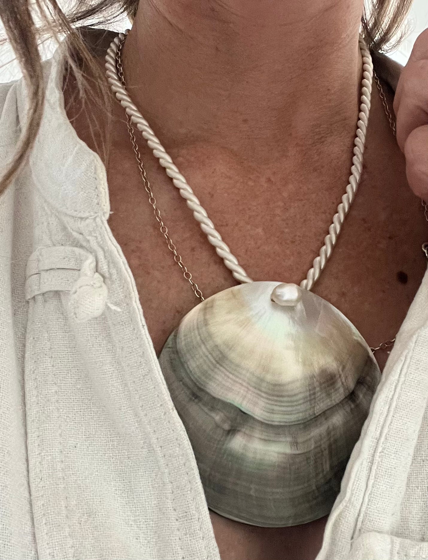 VINT:ISH Halsband gjort av en gammal gardintofs, sötvattenpärla från halsband köpt second hand, snäcka från ett halsband köpt second hand. Metalldelarna, rostfritt stål, är nyproducerade.