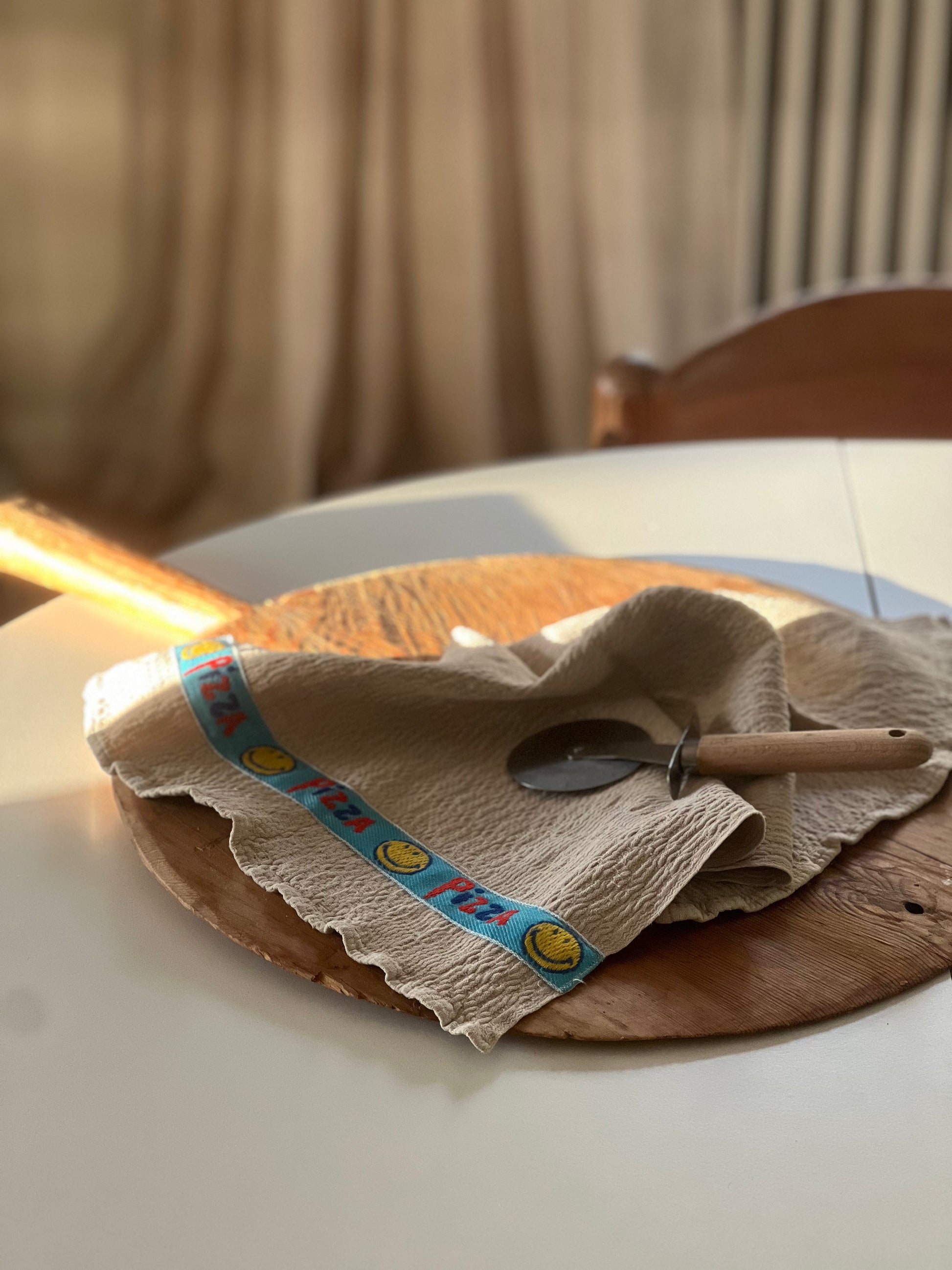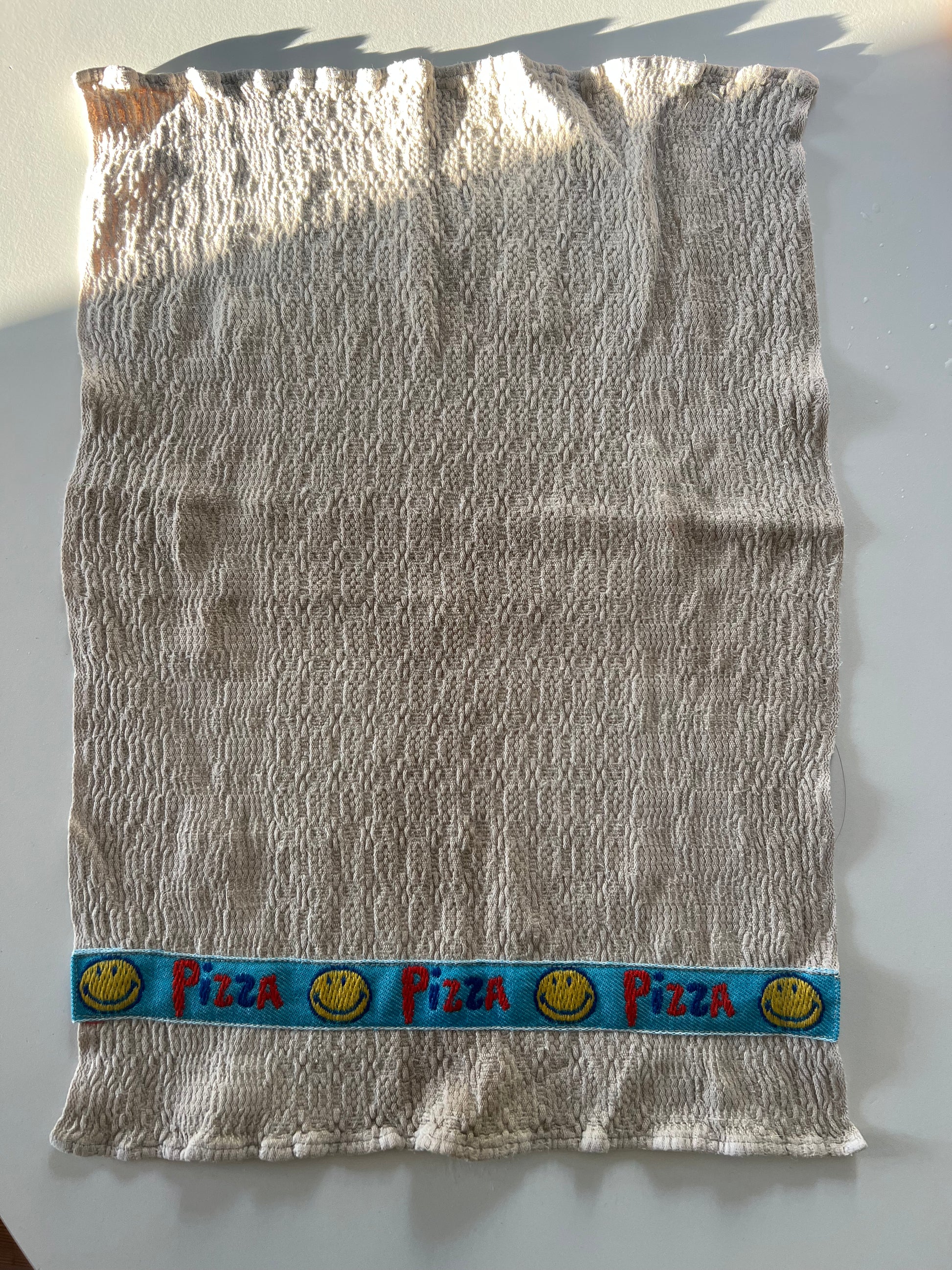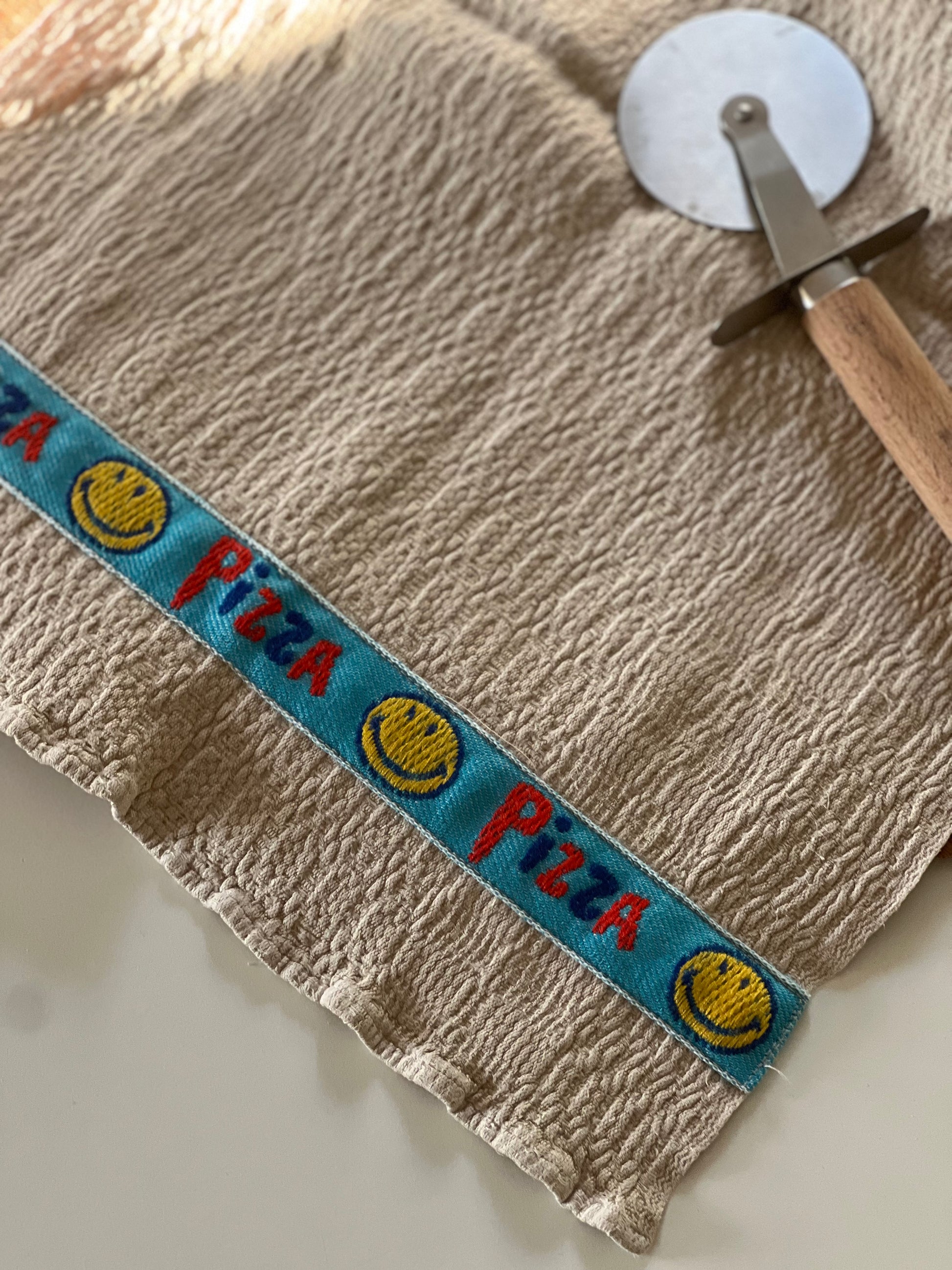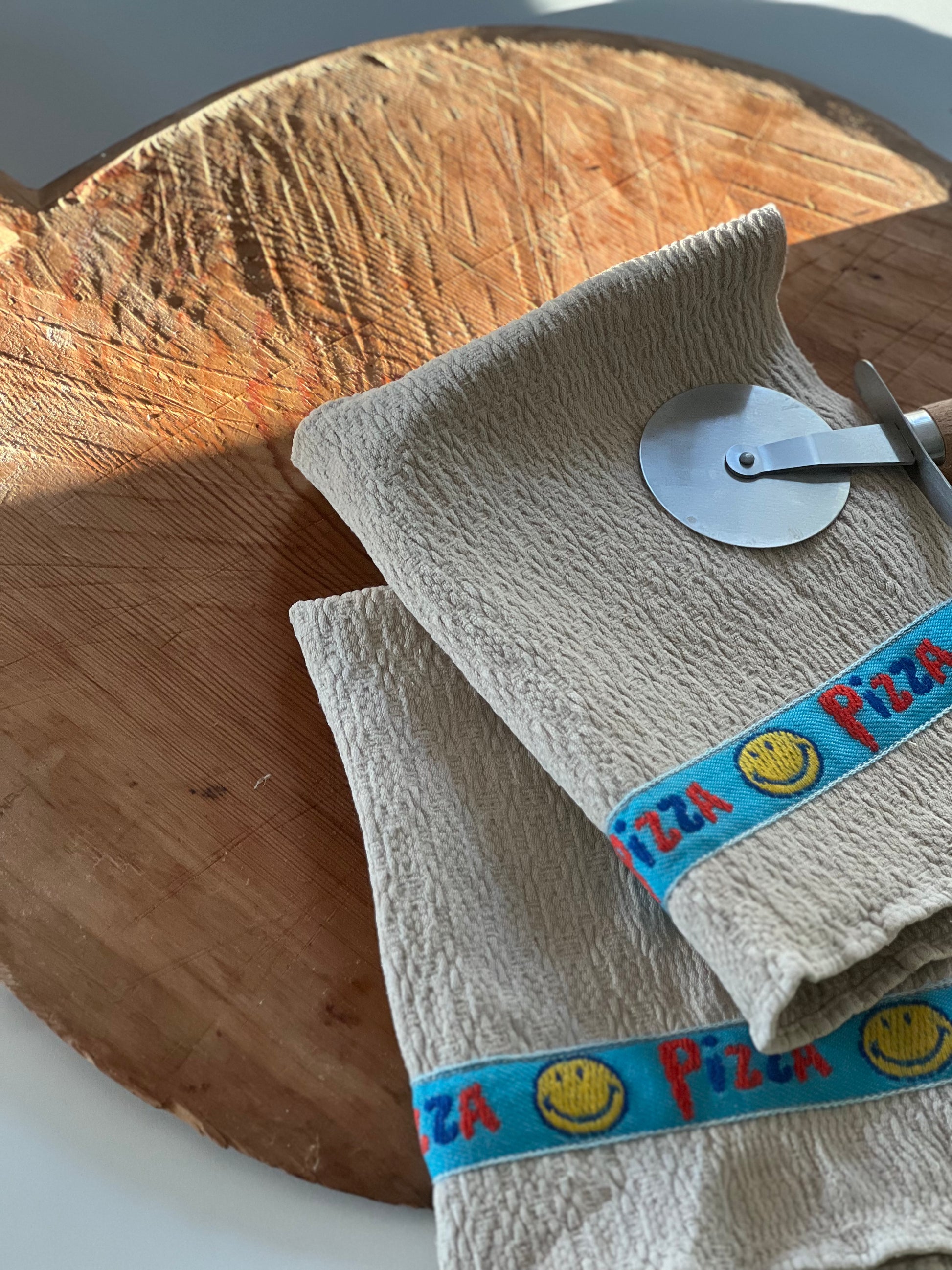 Kökshanddukar / servetter i bomull. Dekor-kant adderad senare med "pizza-budskap".