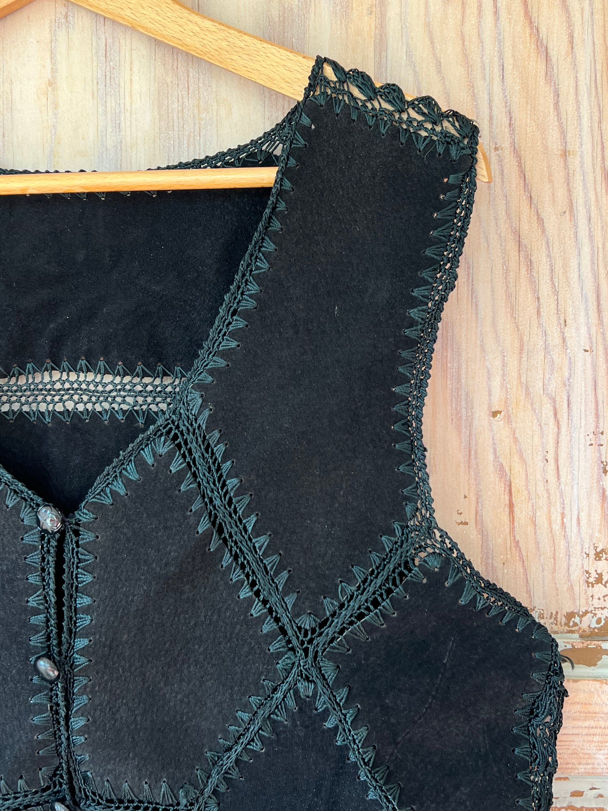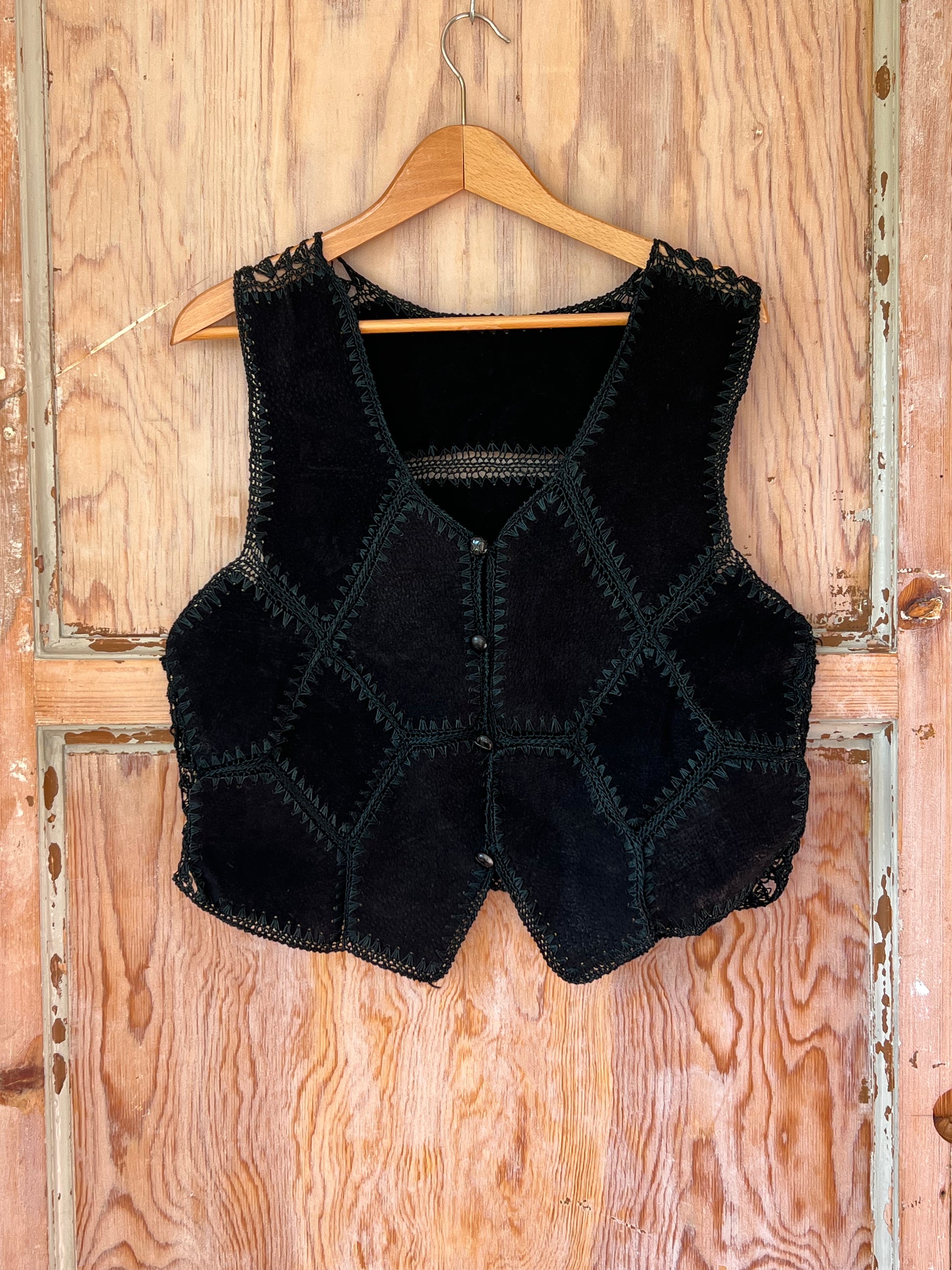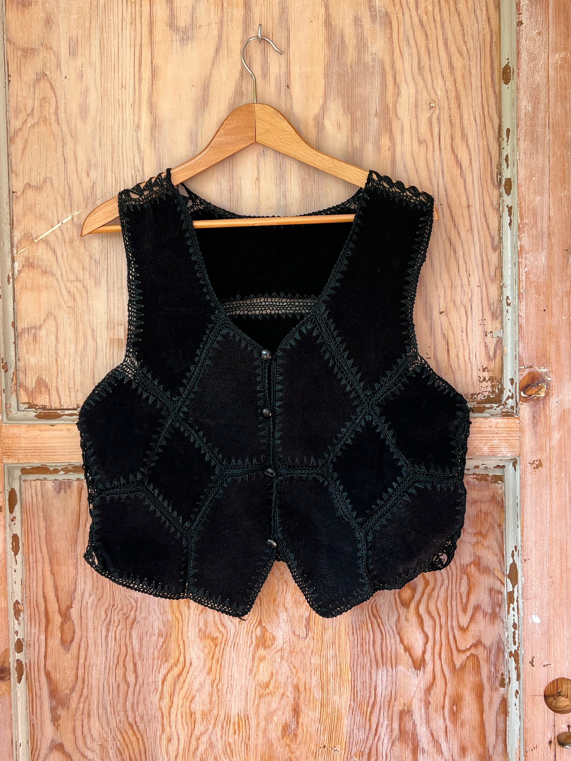 Väst i lappteknik / skinnbitar ihopvirkade.